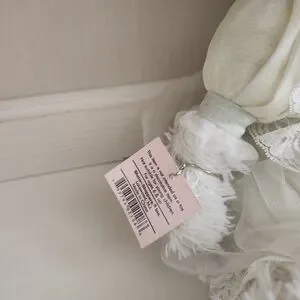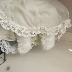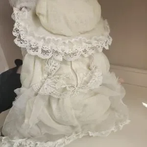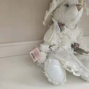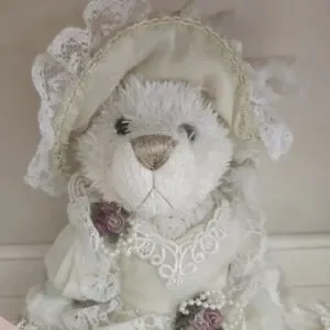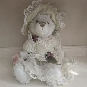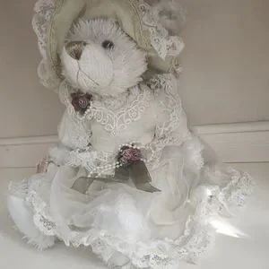 Charming teddy bear dressed in lace with a matching hat. Features delicate floral accents. Excellent Condition Not a Toy Collectible Only