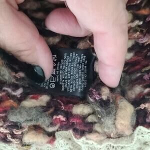 Features a marled knit multicolor wool blend with a beautiful lace-trimmed bottom. This sweater exudes a bohemian, grandmacore, and cabincore vibe, perfect for adding a touch of bohemian luxe or dark academia flair to your style.