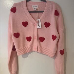 Charming pink cropped cardigan with red heart details. Soft and cozy for any occasion.