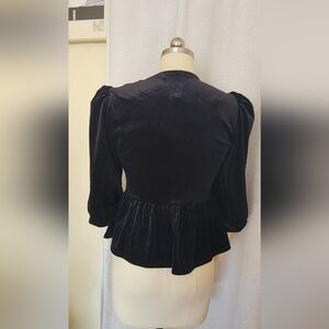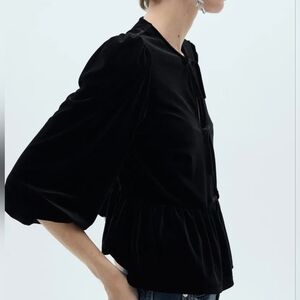 Chic black velvet blouse. Features elegant bow details. Puff sleeves add style.