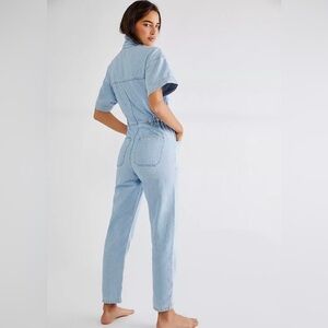 The Free People We The Free “Marci” Denim Jumpsuit is a stylish and comfortable short sleeve, one-piece outfit perfect for a variety of occasions. With a soft, solid, blue color, a collared neckline, chest pockets and a great fit, this jumpsuit features a button closure and straight leg style. Has Pockets on chest and at elasticized waist. 100% cotton, denim fabric, it is ideal for travel, parties, or casual outings. The jumpsuit embodies a bohemian, hippie vibe with its comfortable fit and versatile design, making it a standout piece in any wardrobe.
