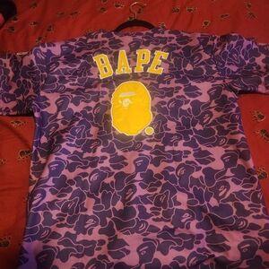 Vibrant purple bape Mitchell and ness shirt with unique pattern. Features Lakers Collection patch. Stylish and eye-catching.