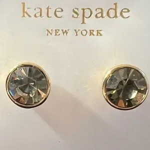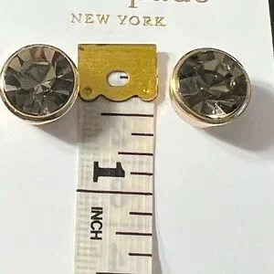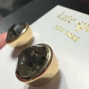 This is a pair of Kate Spade New York stud earrings with smoke grey crystals and a gold-tone bezel.