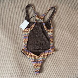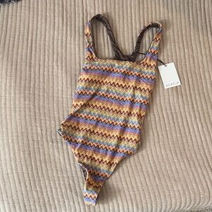Stylish one piece with vibrant zigzag pattern. Features a mix of colors for a bold look. Perfect for beach days.