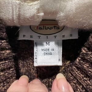 Talbots Chic brown cardigan with vibrant cable knit design. Features colorful accents for a stylish look. Perfect for layering. This is a vintage Talbots sweater;however it’s barely been worn if ever and is in perfect condition. It is very unique and I love the vibrant and rich colors.