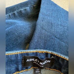 Ashley Mason premium denim stretch fit and flare embroidered floral jeans in women’s size 0/24. Jeans are flared and would fit best for someone shorter than 5’5 for length. Mid rise with beautiful stitched embroidery going up both sides of the leg- very unique. Used in excellent condition. Thanks :)