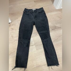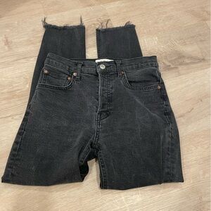 Chic charcoal denim pants. Frayed ankle hem. Classic pocket style.