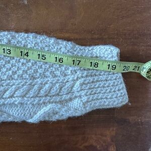 Stay cozy and stylish with this cream cable knit sweater. Perfect for layering in cooler weather. No size, please refer to measurements. I think it would work best for a size M/L. Modeled on a size small mannequin. Leather covered buttons. Natural wool texture. Excellent vintage condition!