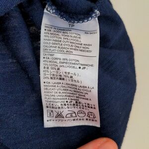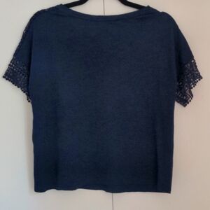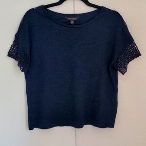 Navy blue Banana Republic tee with crochet accents at the end of both sleeves extending up each shoulder. Loose fit.