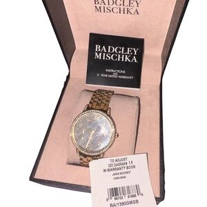 Gold-tone Bracelet Watch with Star Accents by Badgley Mischka. This round (35mm x 41mm) gold-tone case features 82 clear Swarovski crystals. The dial is white genuine mother-of-pearl with a Swarovski crystal-accented star motif. The gold-tone bracelet closes with a jewelry clasp with 1 extender link. The timepiece is water-resistant to 100 feet.