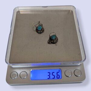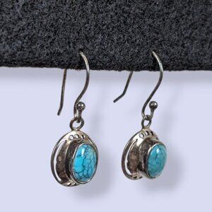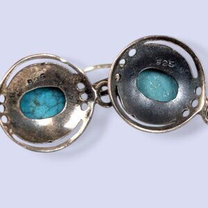 These earrings are made of sterling silver and have simple hook findings. Each earring features a silver circle with small circle and line cut-outs, and a polished, open-back turquoise cabochon in the center. The silver is tarnished and would benefit from a polishing, and the centers aren't exactly identical due to being artisan made, but there are no issues affecting wearability. Both earrings are stamped 925 on the backs.