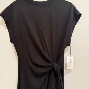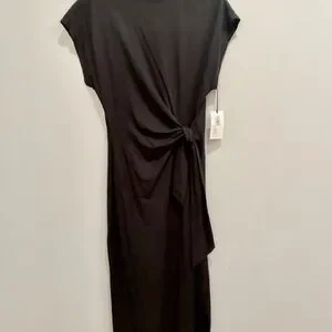 Elegant black midi dress. Features a side tie detail. Short sleeves and round neckline. Perfect for any occasion.