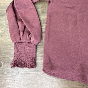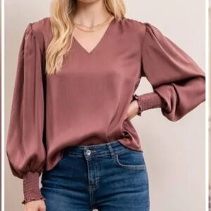 Blu Pepper Women’s Dusty Rose V-Neck Silky Puffy Sleeve Blouse, size Small. In excellent used condition. See pictures for measurements and fabric content. Chic blouse with puff sleeves. Features a flattering V-neck. Ideal for versatile styling.