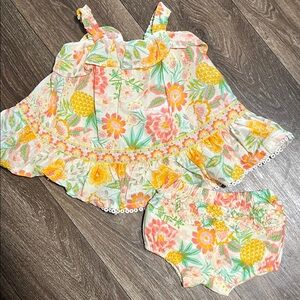 Adorable floral baby outfit with ruffles. Features vibrant yellow, pink, and green colors.