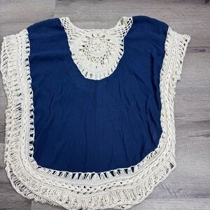 Paradise USA Crochet Top Boho Bohemian Blue & Cream Shirt. No size tag. Measurements in photo. Seems to fit like Medium with an oversized fit.