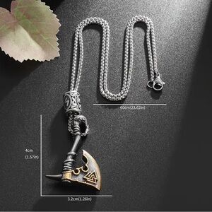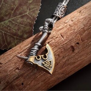 Unique Viking axe pendant necklace. Features intricate designs with silver and gold tones. Perfect for adding a bold statement to any outfit.