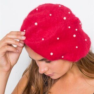 RED fuzzy beret detailed with faux pearls