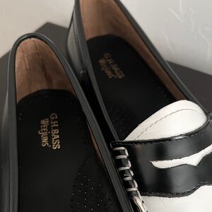 Elegant loafers with a sleek design. Black and white color scheme. Perfect for versatile wear.