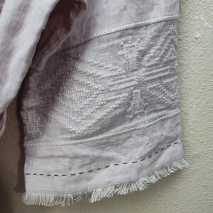 This pretty in pink playsuit is crafted using traditional Ukrainian cross-stitch embroidery and hand-stitched details. Includes 2 tassels and handmade Zbiranka on the neckline, as well as, a belt with two triple tassels and pockets on either side of the shorts. All the embroidery pattern is made by local artists making each piece truly unique. The wide high shorts make this playsuit a comfortable yet stylish vacation must-have.