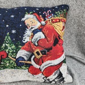 Christmas Tapestry Throw Pillow 16"x12" Blue Santa Sleigh Presents Ornaments Hol