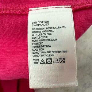 Zip garment before cleaning. Machine wash cold with like colors on gentle. Non-chlorine bleach. Tumble dry low. Warm iron. Do not iron the decoration. Do not dry clean.