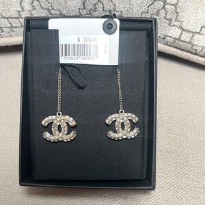 Authentic CHANEL earrings with iconic logo. Silver finish with sparkling crystals. Perfect as a holiday gift to yourself.