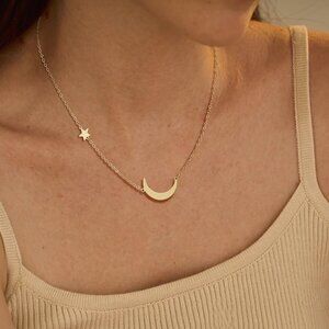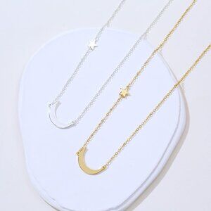 Features: Elegant sideways star and moon pendant necklace, made of gold-plated brass that’s durable and gentle on sensitive skin. Its super sparkly and simple design makes it a versatile accessory for any look — whether you're casual in a T-shirt or dressed up for a night out. Ideal for layering with other necklaces to add a charming touch to your neckline.