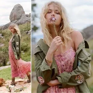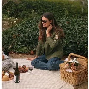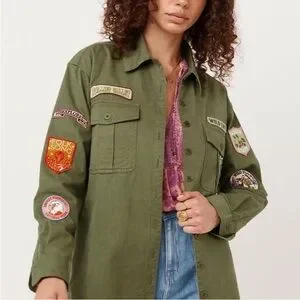 Chic olive utility jacket with vibrant patches. Ideal for a trendy look.