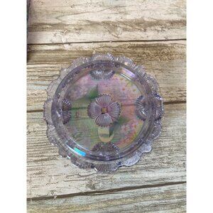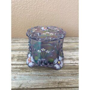 Crafted from lavender iridescent satin glass. The jar features scalloped edges, applied 3D floral accents at each corner, and white daisies hand-painted around the sides and lid.