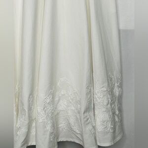 The sweetheart bodice and wide banded waist are cinched with a back zipper while the sweeping swing skirt drops past the knees, complete with an embroidered border and outfitted with side pockets for modern marvels!
