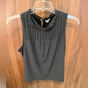 Chic black sleeveless blouse with textured fabric. Ideal for versatile styling. EUC T324