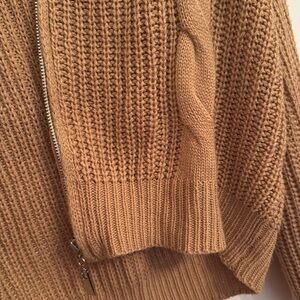 Stay warm and stylish with this cozy tan cable knit sweater. Perfect for layering, this sweater offers both comfort and elegance.
