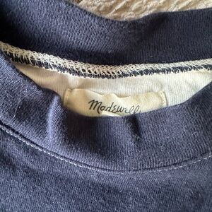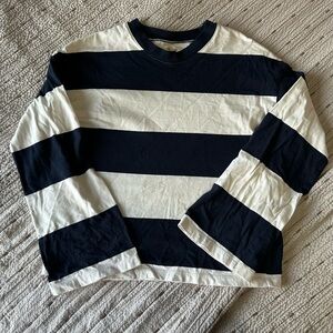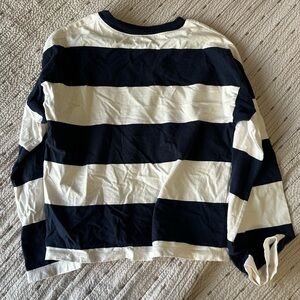 Madewell cropped dark navy and white striped longsleeve. Super cute. No stains, or holes. Good condition. Sleeves are a little wide at the end (the style) not full on bellbottom sleeves though. Super cute. Smoke free home.