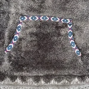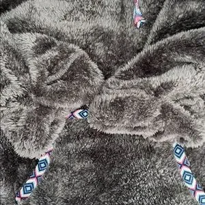 Keep yourself warm and stylish with this cozy grey jacket featuring a unique patterned trim. Perfect for chilly days.