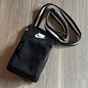 Sleek black crossbody bag by Nike. Features a mesh front pocket and adjustable strap. Perfect for on-the-go style.