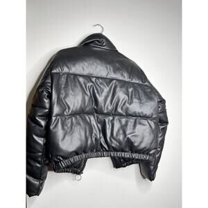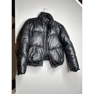 black, puffy, faux leather jacket by the brand Truth by Republic. This type of jacket is designed to provide warmth and insulation, usually filled with down or synthetic fibers, which helps to retain heat. The jacket features a high collar, a zipper closure, and elasticized cuffs and hem. Puffer jackets are a popular choice for cold weather due to their warmth and often water-resistant qualities. The baffles, or quilted sections, are designed to keep the insulation evenly distributed. Faux leather provides a stylish alternative to real leather while often being more affordable and easier to maintain.