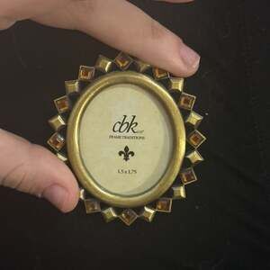 This exquisite Heritage Gold Leaf Oval Photo Frame from cbk FRAME TRADITIONS is a charming addition to any home decor. The frame features a classic oval shape with intricate gold leaf detailing and amber-toned jewel embellishments, adding a touch of vintage elegance. Sized perfectly for small, cherished photographs at 1.5 x 1.75 inches, it's ideal for display on a desk, shelf, or mantelpiece. This piece is in new condition, ready to showcase your favorite memories.