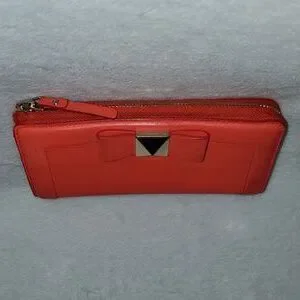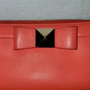 Affixed with a sweet bow and a dose of shine (thanks to a golden pyramid stud at the center) this soft leather continental wallet features a zip-around closure and a shimmering metallic jacquard lining a final shot of shine you'll see any time you reach for your cash or metro card.