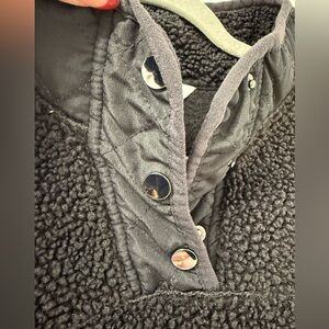 Cozy black sherpa fleece. Features button-up collar. Includes front pocket.