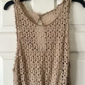 Free People tan tank crochet dress with keyhole opening in the back. Lined with an interior spaghetti strap slip #crochetdress