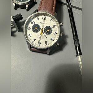 Discover the men's chronograph watch, featuring a sophisticated silver dial with striking black accents. Perfect for any occasion, this timepiece combines elegance and functionality. Brand new battery and brand new leather straps all complements(dials) work