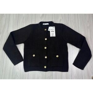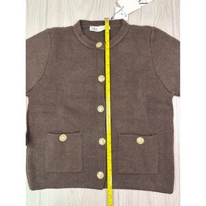 Elevate your everyday style with this chic ZARA knit cardigan. Impeccable craftsmanship defines this piece, featuring a sophisticated crew neck and elegant gold button detailing on the front and stylish patch pockets. The rich brown hue offers a versatile foundation for countless outfits. Perfect for layering over a blouse for a polished office look or adding a touch of refined charm to your weekend ensemble.