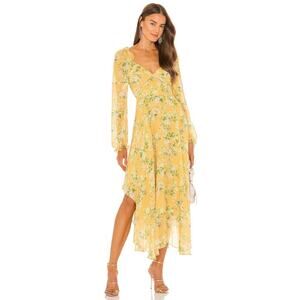 Sau Lee Georgia Flora Midi Dress in Yellow. Partially lined. Hidden back zipper closure. Ruffle shoulder trim and elastic cuffs. Long sleeves. Handkerchief hem. V-neck plunge front. Great used condition.