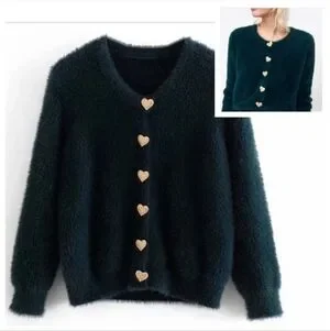 Zara Green Vegan Fur Cardigan Heart Jewel Buttons