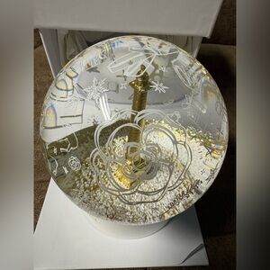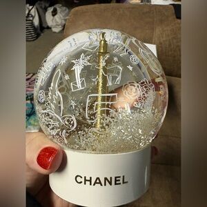 Add a touch of luxury to your décor with this stunning Chanel snow globe, featuring elegant gold and white detailing. The globe showcases iconic Chanel motifs—camellias, stars, gift boxes, and more—surrounding a shimmering gold centerpiece. A true collector’s item!