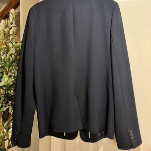 I must have staple in your wardrobe! Classic navy blue stand collar, looks amazing with jeans or khakis. Like new. Substantial fabric with a single button closure .Features sleek lapels and front pockets. Ideal for professional settings. Newly dry cleaned. Smoke free home.