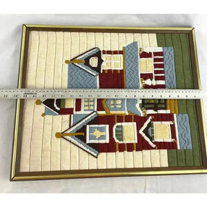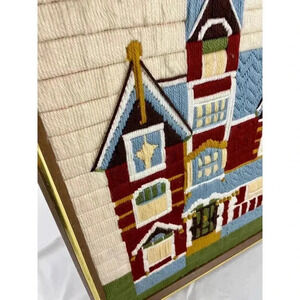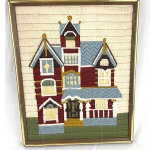 VTG Bernat Victorian Home Framed Needlepoint Crewel Wall Art 17"x21" Handmade