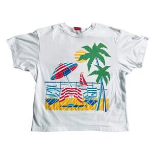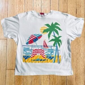 Pictured is a Young Stuff classic1980s graphic T-shirt in a relaxed fit. fantastic beach-themed printed graphics.