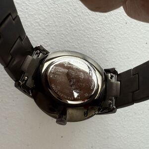 There are stains and scratches on the bracelet and back of case as shown in pictures. No box and warranty. Resized strap with parts available to be adjusted.