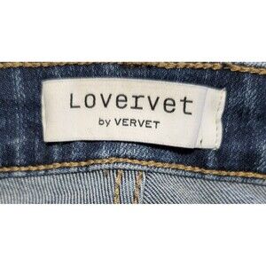 Cute and flattering pair of straight-leg jeans from Lovervet by Vervet, known for soft stretch denim and great shaping. Size womens 31. Medium blue wash with light fading and gentle fray distressing at hemintentional lived-in look, not damage. Comfortable everyday denim that pairs well with sandals, sneakers, and boots.
